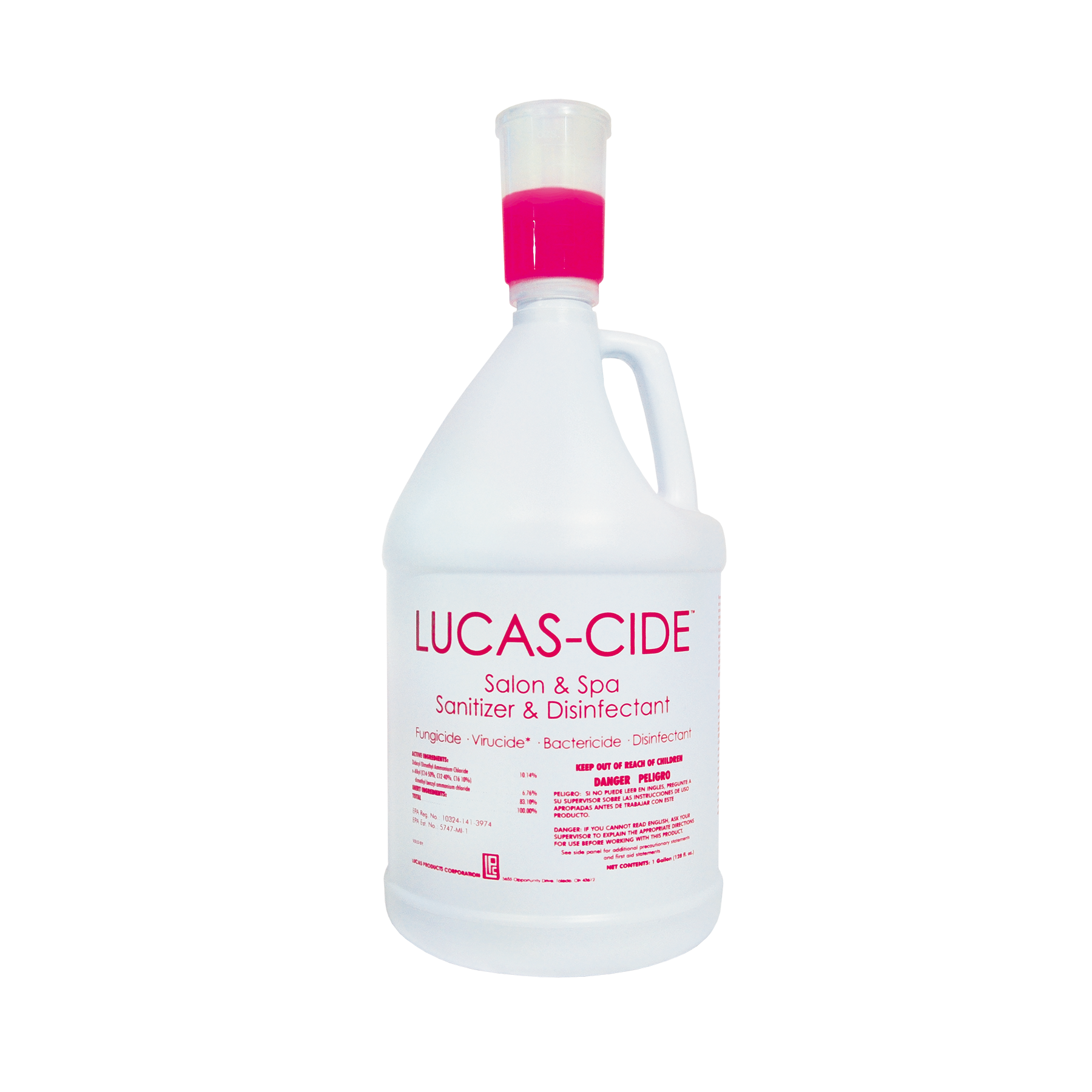 The patented LUCAS-CIDE Squeeze & Pour Lid – Gallon screws on to a gallon size bottle of LUCAS-CIDE Concentrate Disinfectant, allowing you to simply squeeze the desired amount of of solution into the cup to pour it directly into a pedicure spa or other disinfectant container. Next, add the appropriate amount of water to mix your desired quantity of solution. Follow directions for use and precautions on the LUCAS-CIDE label prior to use. LUCAS-CIDE Squeeze & Pour Lid – Gallon has graduated measurements to simplify your pedicure cleaning and disinfection process!